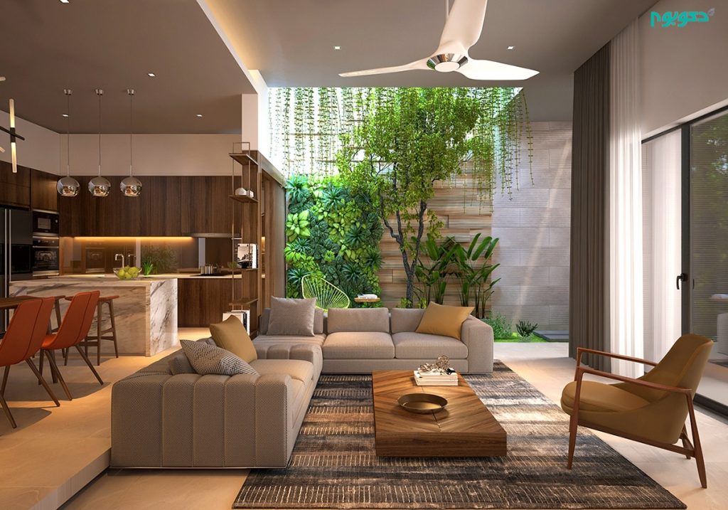نکته بارز در طراحی داخلی این خانه بسیار زیبا ایجاد فضای سبزی در محیط داخلی خانه است که توسط چمن