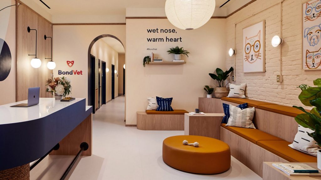 رنگهای خاکی و متریال های ملایم و سبک در طراحی دکوراسیون داخلی این مرکز دامپزشکی به منظور کاهش استرس در